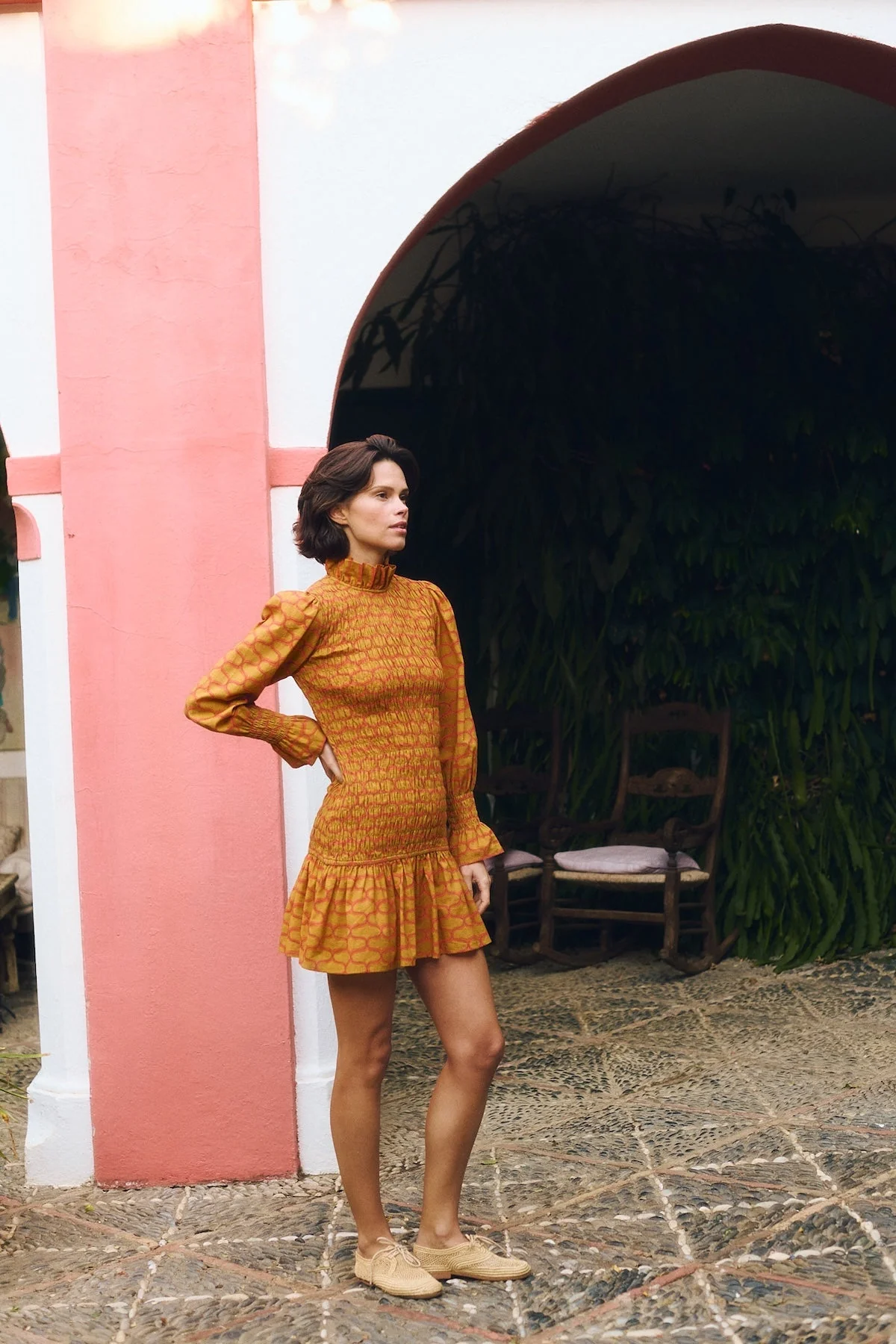 The Aleria Short Dress, a fitted silhouette in vintage smocked fabric, designed for an elegant everyday look