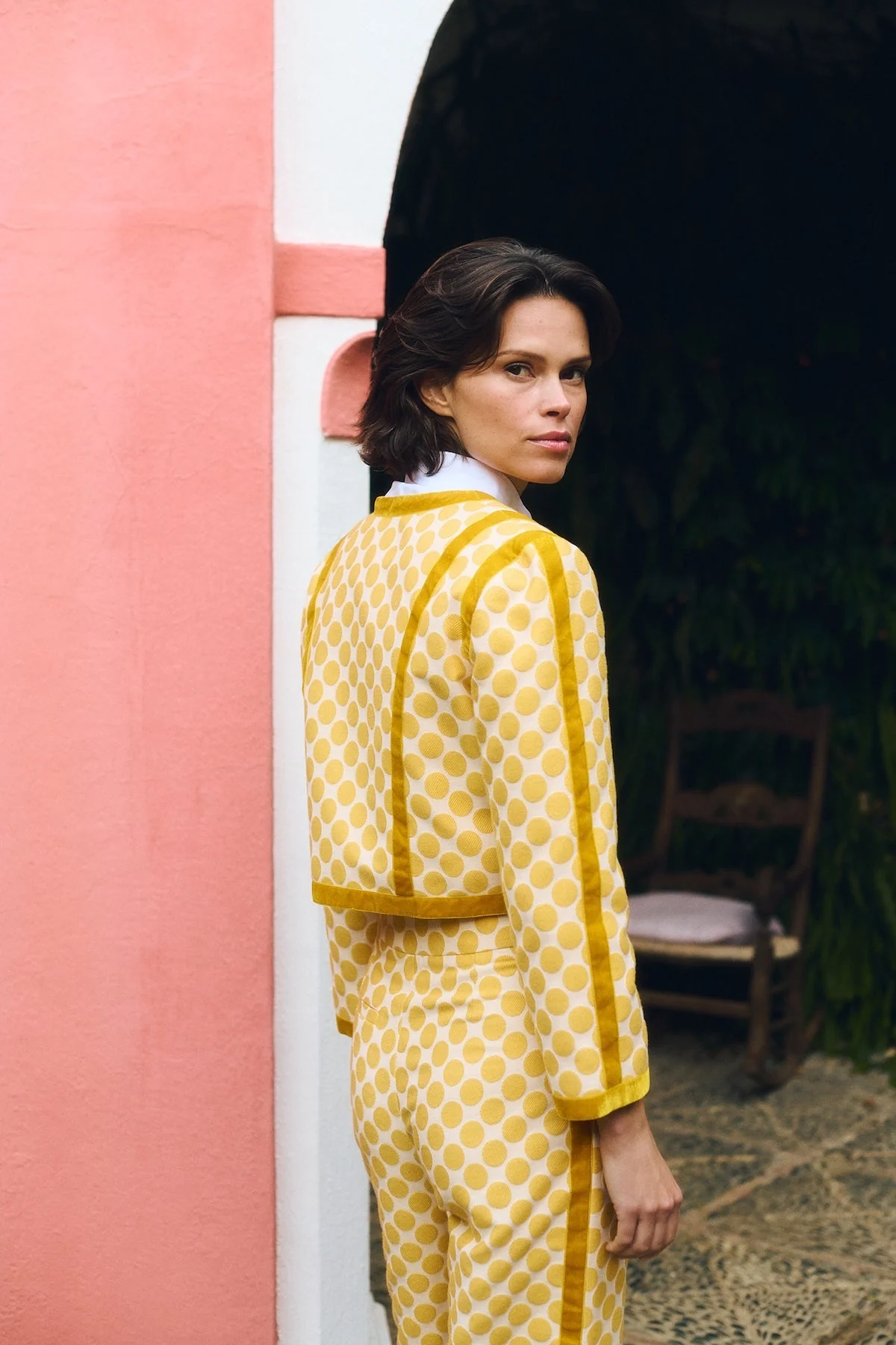 The Jones Jacket brings sunshine to your wardrobe, a tailored piece distinguished by original polka dots and velvet yellow details