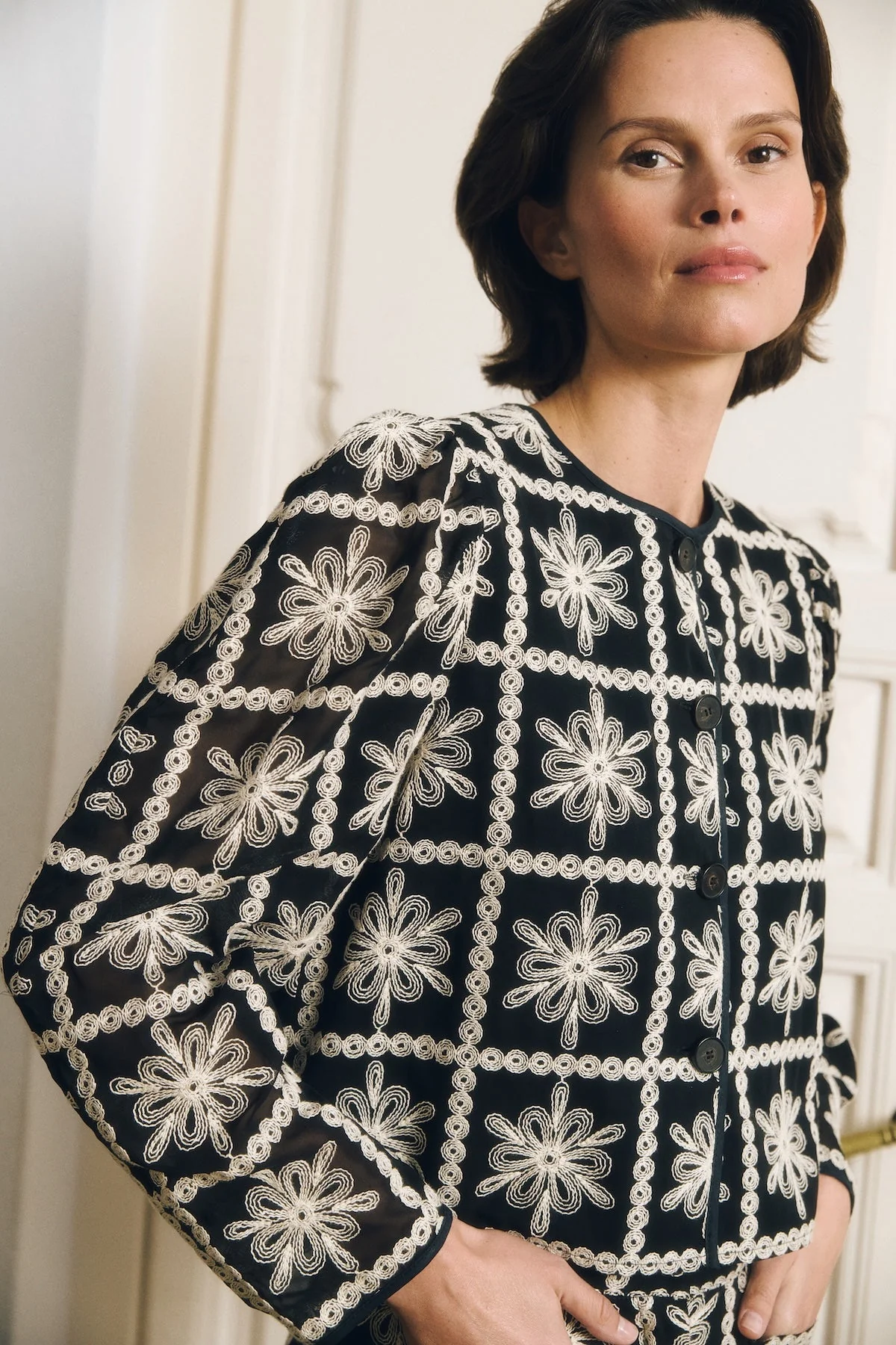 The Jonquille Jacket, defined by its playful puff sleeves and cropped silhouette, features a scattering of embroidered white daisies all over