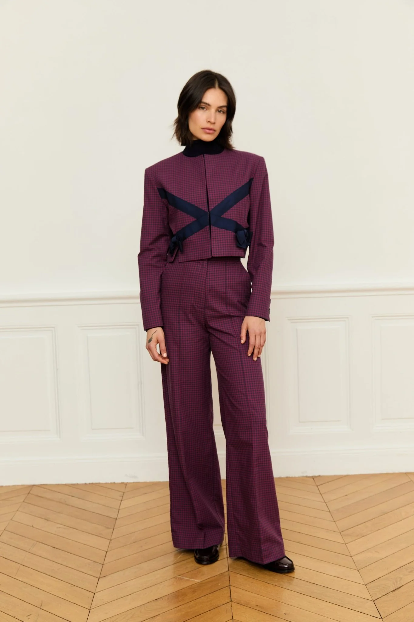 Red checked jacket with navy bows details