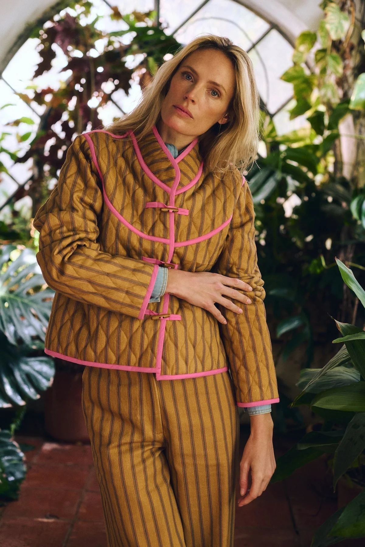 The Jupiter Jacket offers a cozy feel, combining soft quilting with graphic stripes and distinctive fastening details